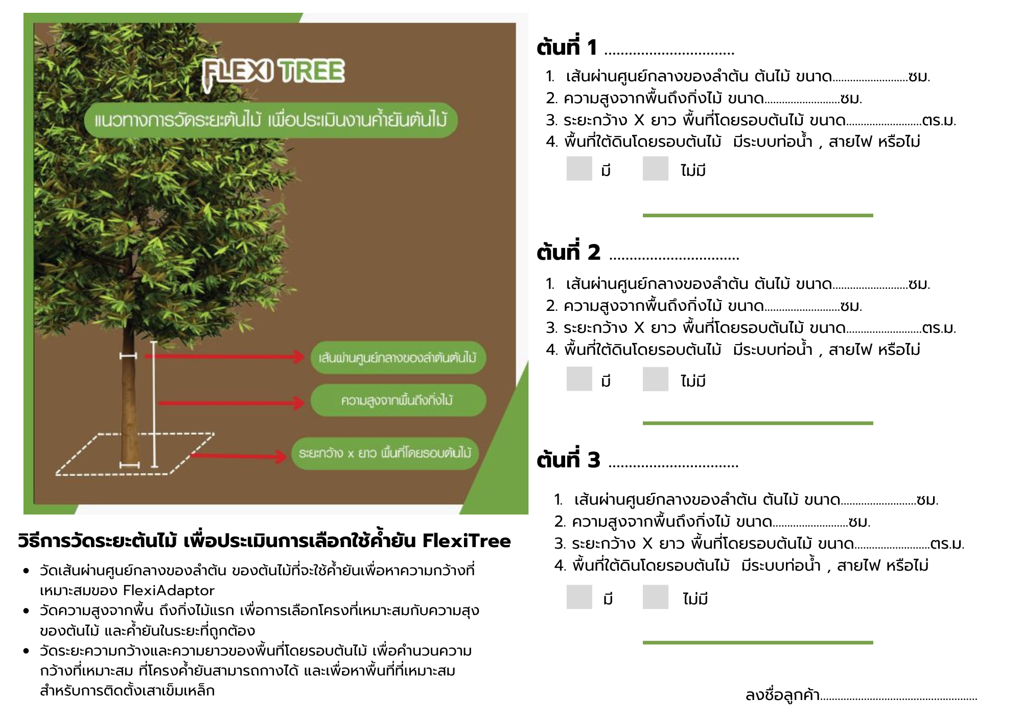 ให้บริการด้านการออกแบบ ผลิต และจัดจำหน่าย ชุดโครงเหล็กค้ำยันต้นไม้พร้อมเสาเข็มเหล็ก ที่จะช่วยปกป้องดูแลต้นไม้ให้เติบโตได้อย่างมีประสิทธิภาพ แข็งแรงตั้งแต่ฐานรากด้วย FlexiRoot โดยใช้เสาเข็มเหล็กหยั่งลึกลงไปใต้ดินเปรียบเสมือนรากแก้วเทียมให้กับต้นไม้ ยึดโยงลำต้นไม่ให้โอนเอนจากลมแรง พายุฝน ด้วยโครง FlexiAdaptor โครงสร้างเหล็กที่ไม่เพียงแข็งแรงด้วยวัสดุ แต่ยังสามารถปรับลดและขยายขนาดได้ตามการเติบโตของต้นไม้ ไม่บีบรัดจนกินเนื้อไม้ โดยมีอายุการใช้งานมากกว่า 5 ปี และติดตั้งโดยไม่ใช้การเชื่อม จึงไม่เป็นอันตรายต่อต้นไม้ แถมยังสามารถเลือกเพิ่มฟังก์ชั่นต่างๆได้ตามชอบ โดยมีทั้ง ที่นั่ง ชิงช้า และ Chill Bed ให้ค้ำยันต้นไม้เป็นได้มากกว่าการปกป้องดูแลต้นไม้ที่คุณรัก
