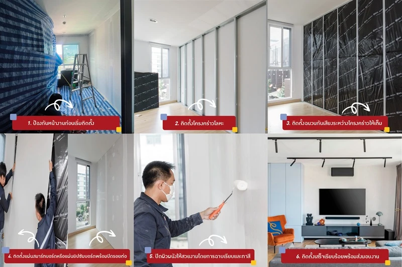 3. ป้องกันเสียงอย่างมีประสิทธิภาพด้วยวัสดุอะคูสติก: บริการติดตั้งที่ได้มาตรฐานจะเลือกใช้วัสดุอะคูสติกที่ออกแบบมาสำหรับป้องกันเสียงโดยเฉพาะ ได้แก่ SCG Cylence Zoundblock ประกอบเข้ากับโครงคร่าวและปิดทับด้วยแผ่นยิปซั่มบอร์ดหรือสมาร์ทบอร์ด ทำให้ระบบผนังสามารถกันเสียงได้จริงตามมาตรฐาน