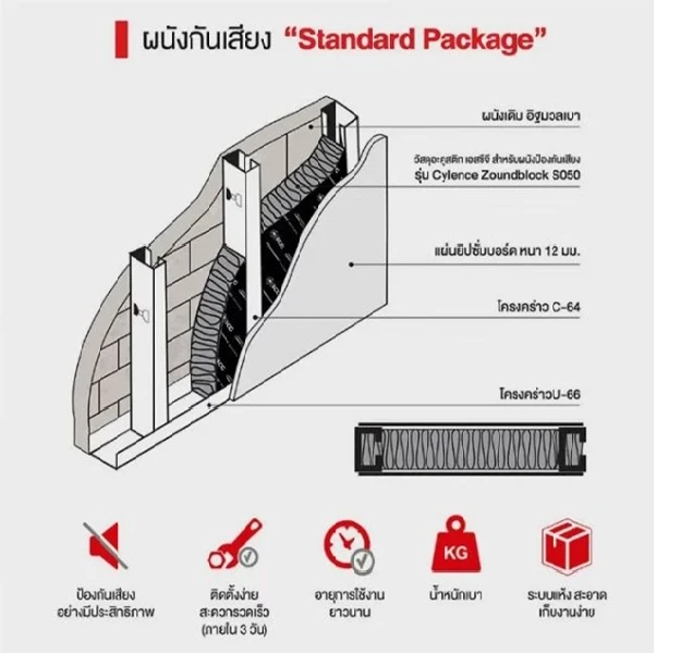 ประกอบด้วยโครงคร่าวโลหะ U-66 และ C-64 ร่วมกับวัสดุอะคูสติก เอสซีจี สำหรับผนังป้องกันเสียง รุ่น Cylence Soundblock S050 ปิดทับด้วยแผ่นยิปซัมบอร์ดหนา 12 มม. พร้อมฉาบเรียบและทาสี ความหนาระบบผนังกันเสียง Standard Package เท่ากับ 7.7 cm.