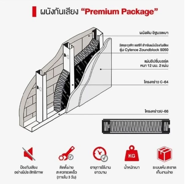 ประกอบด้วยโครงคร่าวโลหะ U-66 และ C-64 ร่วมกับวัสดุอะคูสติก เอสซีจี สำหรับผนังป้องกันเสียง รุ่น Cylence Zoundblock S050 ปิดทับด้วยแผ่นยิปซัมบอร์ดหนา 12 มม. จำนวน 2 ชั้น พร้อมฉาบเรียบและทาสี ความหนาระบบผนังกันเสียง Premium Package เท่ากับ 8.9 cm.