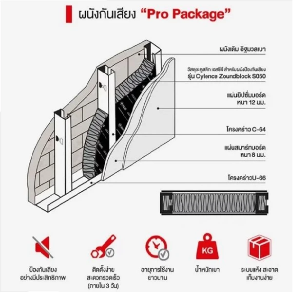ประกอบด้วยโครงคร่าวโลหะ U-66 และ C-64 ร่วมกับวัสดุอะคูสติก เอสซีจี สำหรับผนังป้องกันเสียง รุ่น Cylence Zoundblock S050 ปิดทับด้วยแผ่นสมาร์ทบอร์ดหนา 8 มม. และแผ่นยิปซัมบอร์ดหนา 12 มม. พร้อมฉาบเรียบและทาสี ความหนาระบบผนังกันเสียง Pro Package เท่ากับ 8.5 cm.