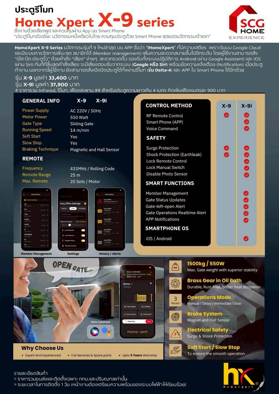 - X-9i : สั่งงานเปิด-ปิดประตูรั้ว ผ่าน APP บน Smart Phone ทั้งระบบปฏิบัติการ Android และ iOS และผ่านรีโมท ราคา 37,900 บาท