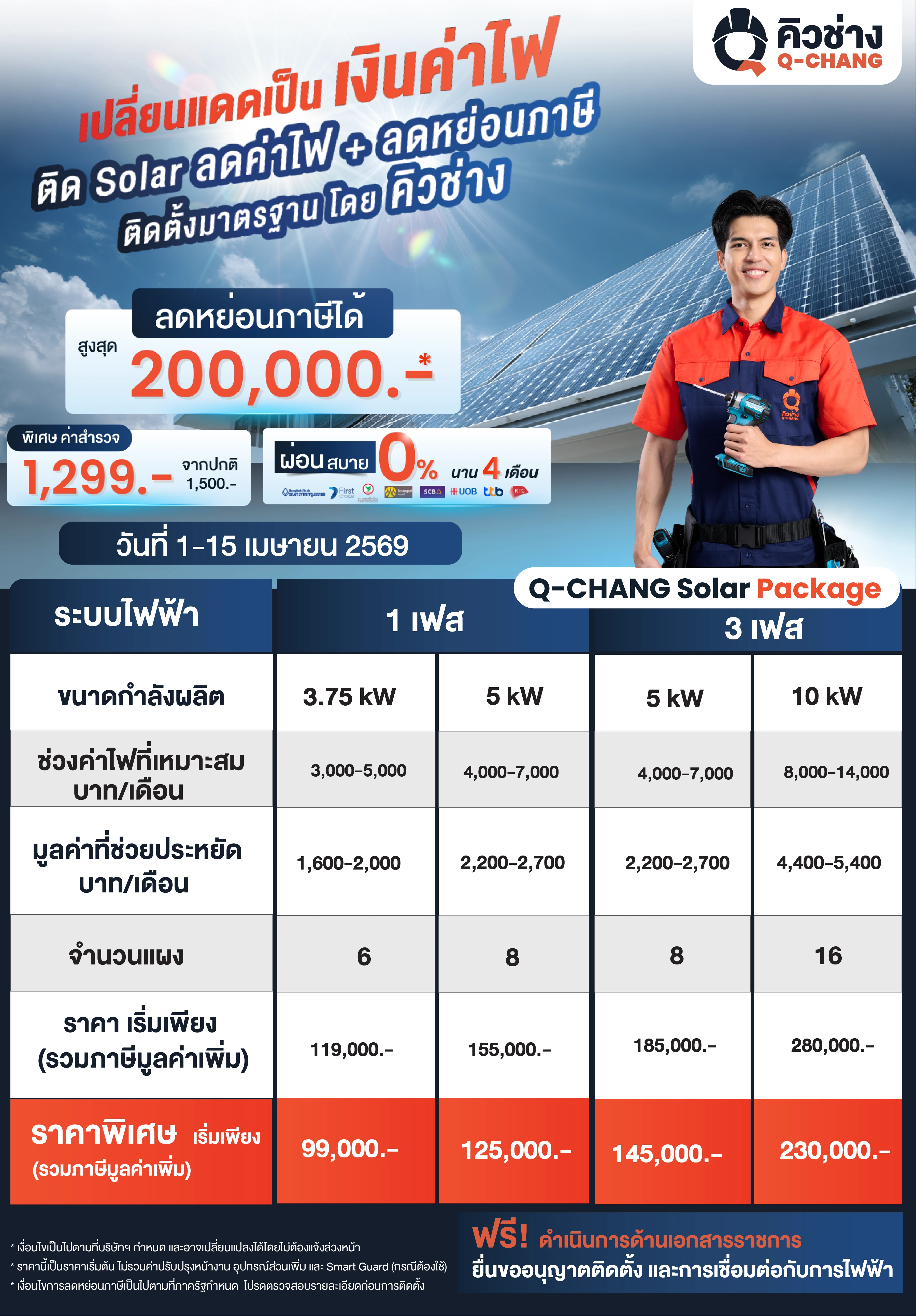 ติดตั้ง Solar Rooftop กับ Q Chang เริ่มต้นเพียง 99,000.- ออก E-Tax ได้ พร้อมลดหย่อนภาษี