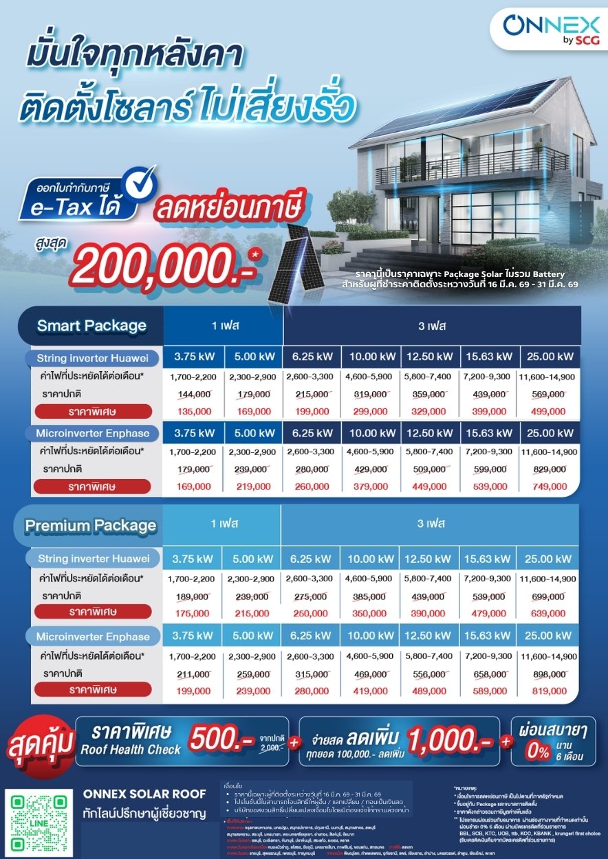 - ต่อที่ 2 : Package Solar ราคาพิเศษ เริ่มต้น 91,000.- (จากปกติ 106,000.-) เมื่อชำระค่าติดตั้งภายใน 1 มี.ค. 69 - 15 มี.ค. 69