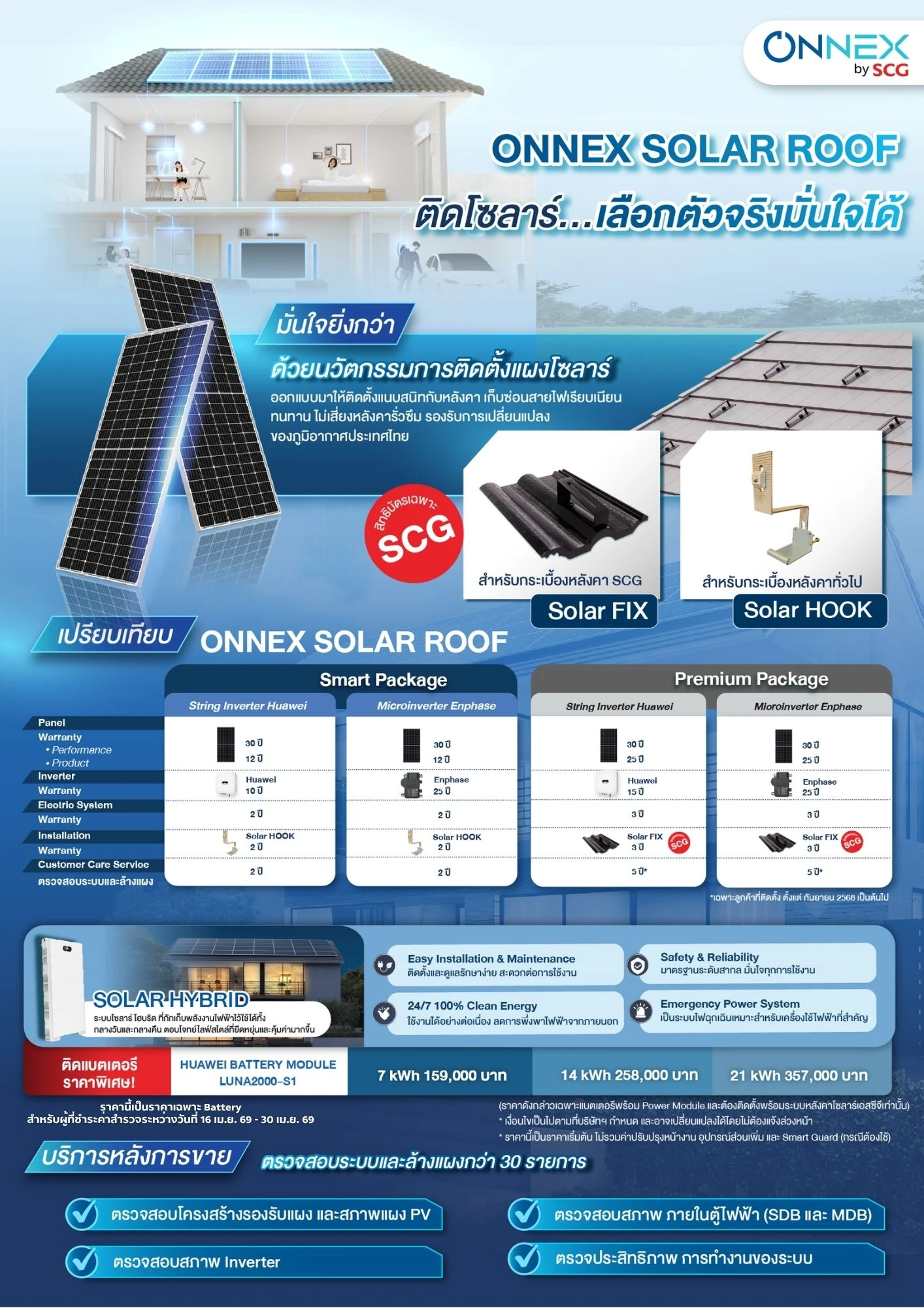 - มี After Sales Service ตรวจสอบระบบและล้างแผง 2-5 ปี ขึ้นกับ package ที่เลือก
